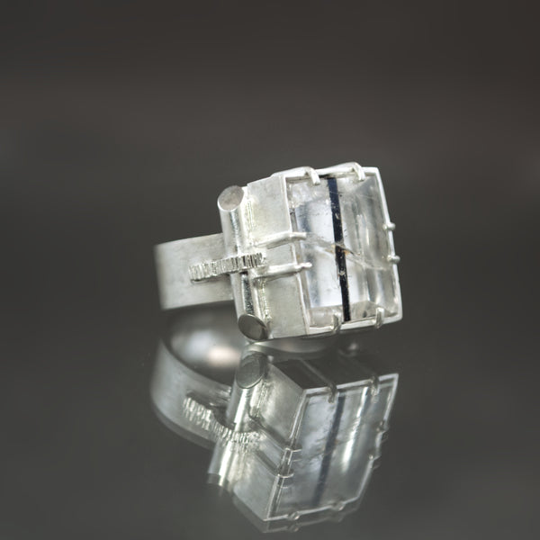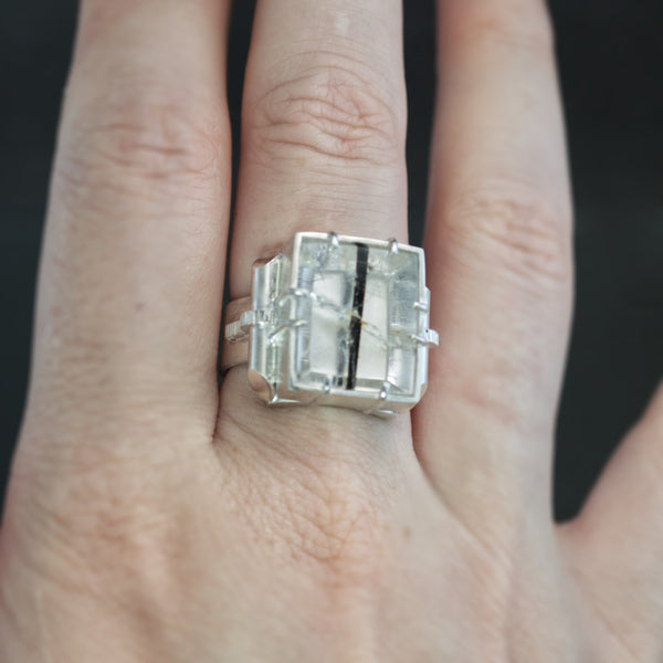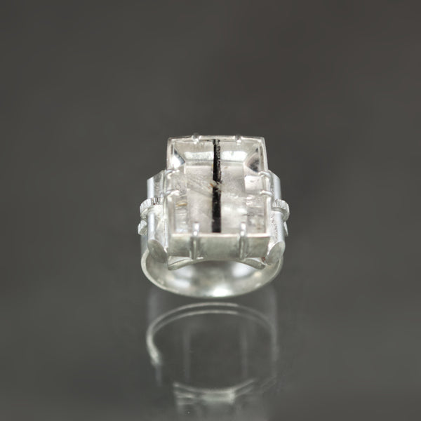 A minimalist included quartz meets maximalist metalwork in this handmade sterling silver statement ring. The large rectangular buff-top gem houses a single needle of black tourmaline - naturally formed and running vertically through the rock crystal. A polished silver backplate ensures optimal shine and contrast while 8 prongs clutch the stone securely in place from within a solid-walled bezel. To either side, a Retro-era inspired scroll and ribbon design decorates the shank. Coined texturing and angular faceting provide machine age sparkle and allure. Sized an 8, the comfort-fit band rests lie weighted silk on your finger despite it's 8mm width.