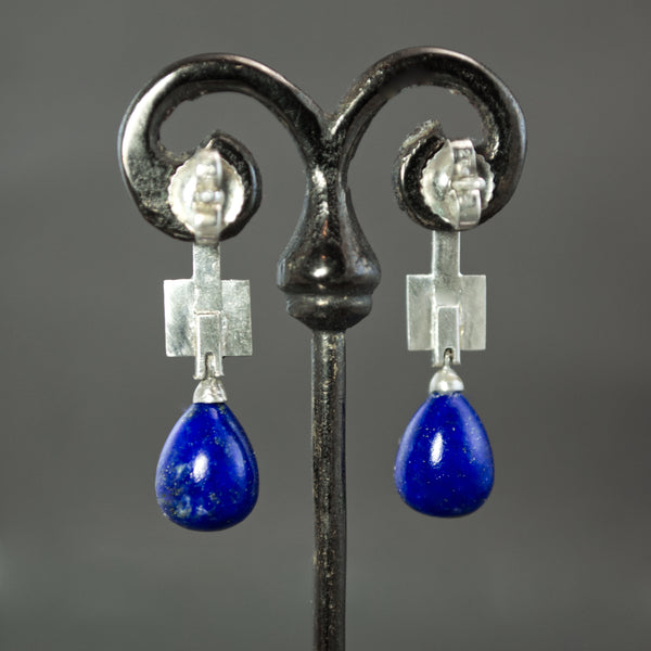 Created in sterling silver by combining the azure allure of lapis lazuli with faceted and glistening elements of precise metalwork, these earrings are a geometric dream. Affixing to the ear via a post and pushback, a single pillar of silver that has been filed into an elongated paneled crest that ends with shorter duplicate shape to either side. Between these, a bar of coined textured metal adds texture and sparkle. A glossy droplet of lapis swings below from a subtle hinge.