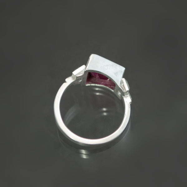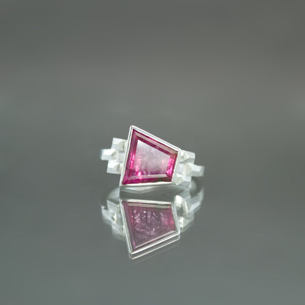 A vivid pink tourmaline is the centerpiece of this art deco sterling silver ring. With metalwork inspired by lapidary geometry, the large tapered baguette-cut stone is the perfect pairing. Each shoulder of the ring is adorned with a symmetrical trio of elongated pyramid forms that present the horizontally set natural gemstone. Within the tourmaline, an intense color and a hazy disposition occasionally give way to a plane of glinting, ice-like inclusions.