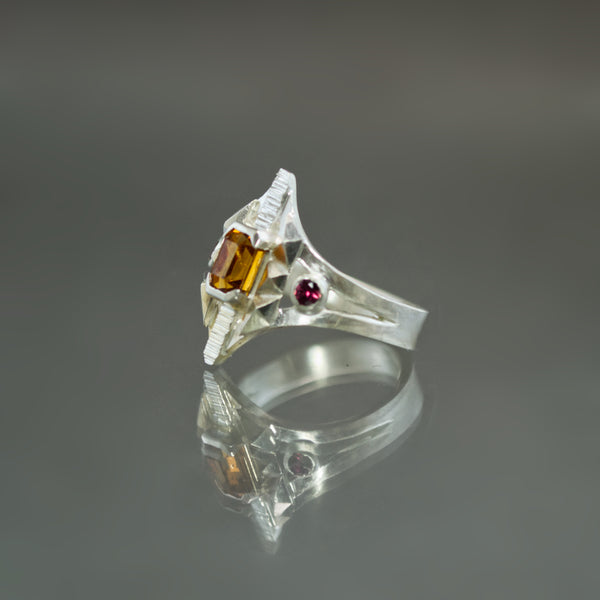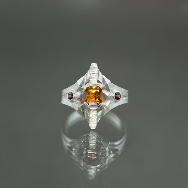 Warm hues and honed edges make an impact in this sterling silver ring. Entirely hand-fabricated beginning with wire and sheet stock, a split-shank band comes to a point at top and bottom to create a canvas for texture and stone. Spanning that frame is a trio of textured silver - a middle coined bar flanked on either side by a frusta-carved column. At the center of the tableau, an emerald-shaped spessartine garnet in vivacious tangerine tantalizes from a bracketed bezel setting. The entire design is bookended by a pair of bezel-set round red sapphires.