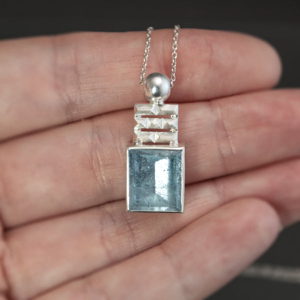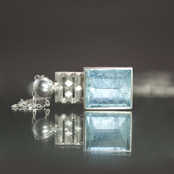 A bewitching aquamarine brings celestial charm to crisp geometry in this one of a kind pendant. The natural, rectangular gem is bezel set in sterling silver. Its uncomplicated mirror faceting creates large visual fields where the stone's vibrant blue color can shine. Above, a trio of silver bars - hand carved with an ordered art deco pattern similar to brick layers - spans an airy frame and offers a velvet-like sparkle. A spherical bail complements the otherwise right angled silhouette and suspends it effortlessly.