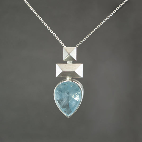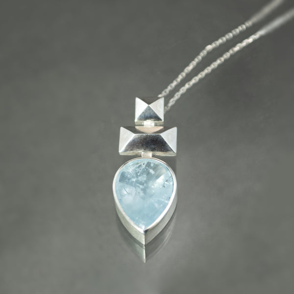 The rays of soft blue light bouncing through patches of haze in this natural aquamarine are like parting clouds across calm skies. A geometric stack of a square above a rectangular pyramid ornament meets the curve of pear-cut blue beryl, which has been bezel-set point downward. The art deco architecturally inspired elements combine in color, facet, and silhouette to create an abstractly nautical vibe. At first glance, the design evokes the sails of a tall ship on the horizon. Worn long or short for work or fun, this pendant will easily become a staple of your jewelry wardrobe.