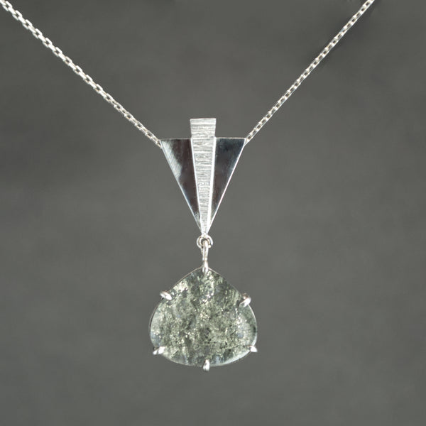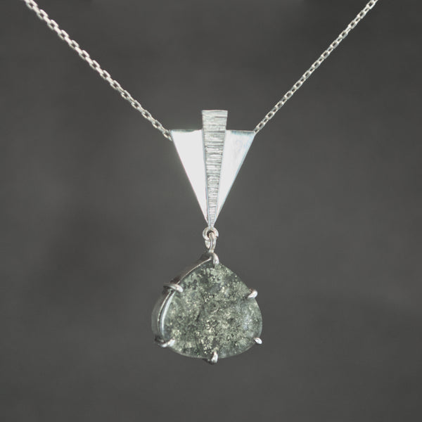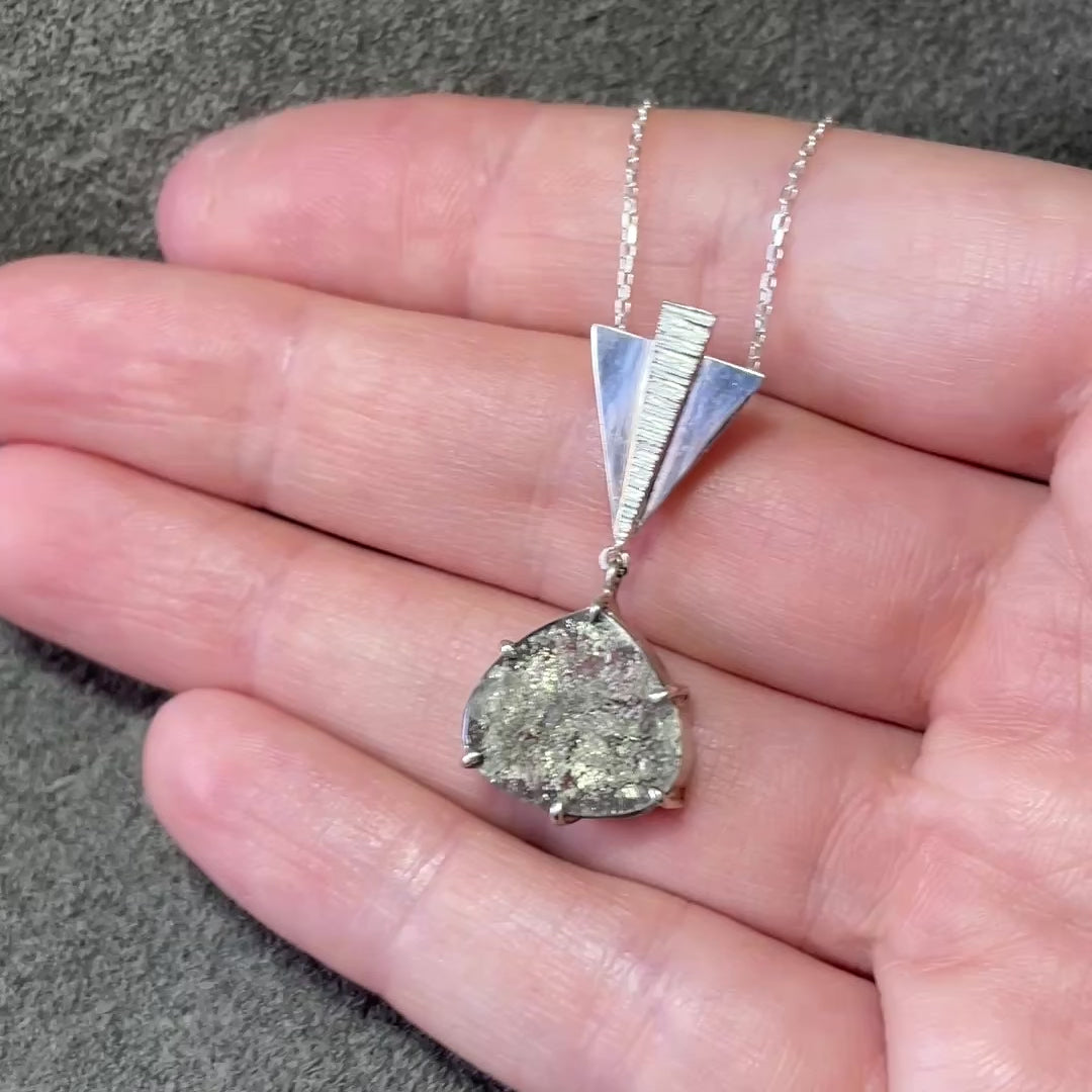 The natural pyrite inclusions inside this pear-cut quartz gem are like silver tinsel - full of texture and sparkle. With nearly the entire surface of the stone covered in metallic crinkle, the crisp clear gloss of the rock crystal face creates an effect like watching water over granite in a mountain stream. Six prongs subtly clutch the stone, whose evocative organic character pairs beautifully with the constructed geometry of the metalwork. An Art Deco, architecturally-inspired fan ornament suspends the gem, meeting at its point and radiating upward into panels of polished silver and glittering coined texture. A concealed bail artfully attaches the pendant to a sterling silver cable chain in your preferred length.