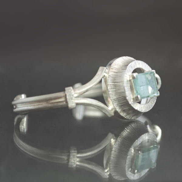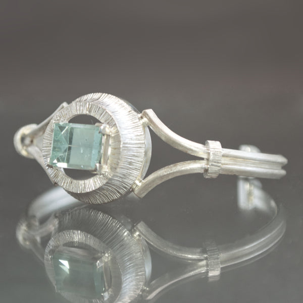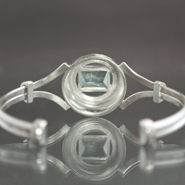 A little bit Art Deco and a little bit Retro, this aquamarine cuff bracelet is a work of vintage-inspired glam. A rectangular aquamarine with a pared down mirror-cut shines in soft baby blue where it seems to delicately balance the center of a wreath of silver texture and form. A coined halo radiates sparkle above a flared platform that adds curve and depth. Split-shank style arms formed from triangular sterling extend from each side to make the basic structure of the bracelet. A matte finish lends a softness to the linear cuff with periodic collars of coined metal along each arm referring back to the twinkle of the centerpiece.