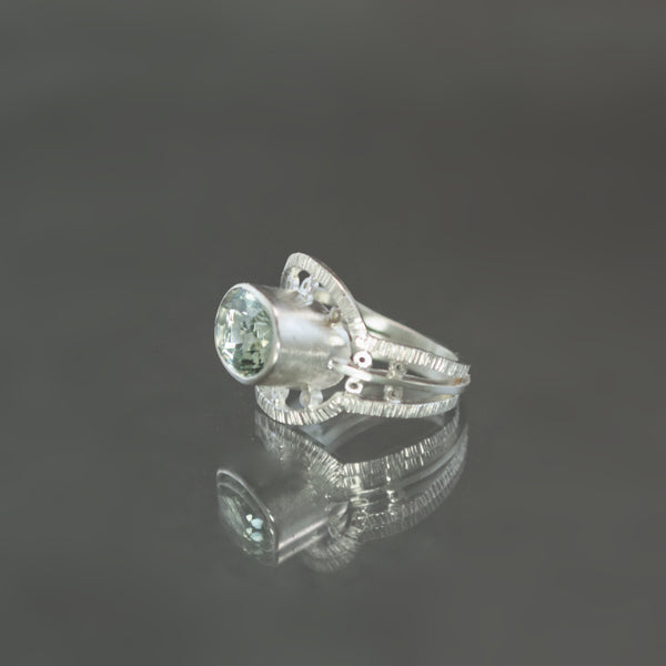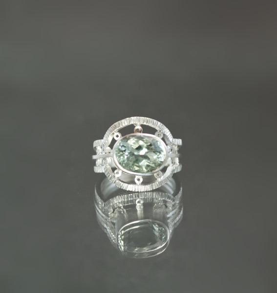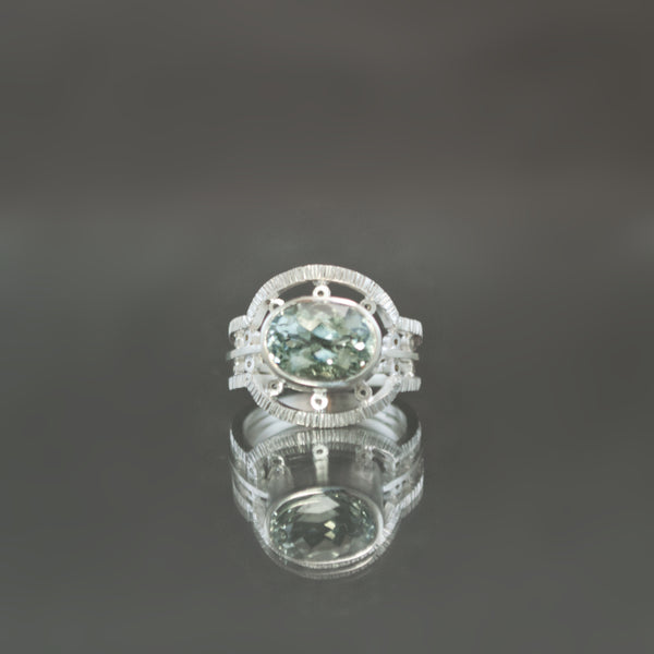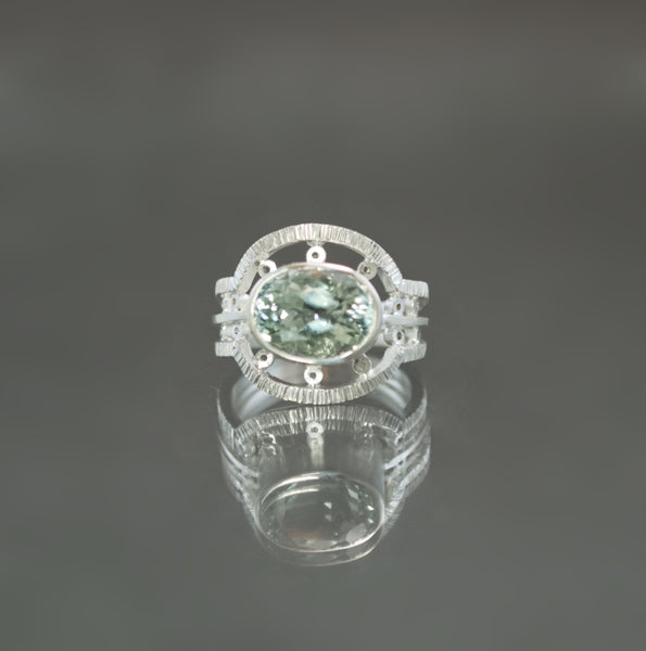 Hand fabricated in sterling silver with layers of texture and shape, this one of a kind Art Deco inspired ring features a natural and untreated green topaz oval weighing 3.38cts. The stone is held securely in an east-west bezel setting that is surrounded by airy architectural metalwork. A row of delicate circles radiates from the stone to create alluring filigree-like geometric lace bordered by arcing lines of silver. These outer bands have been given a sparkling coined texture that adds structure as well as softness to the design. The pattern converges in the back to create a slimmer band for a more comfortable fit.