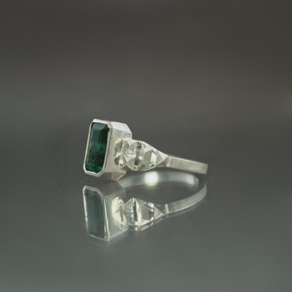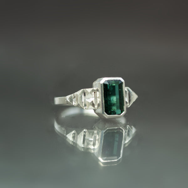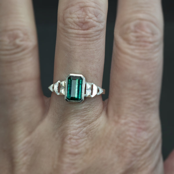 It's hard to pull your eyes off the delectable teal of this tourmaline culet ring. Bezel-set in sterling silver, the natural emerald-cut gem is alive with lush green sparkle. The setting sits at the center of a band of texture created by rows of artfully faceted silver. Inspired by lapidary geometry ("culet" is the term for the point at the back of a cut gem), the silver bars flash with a velvet-like shine across crisp pyramidal points aligned into a laid brick pattern. A thin band at the back makes this ring comfortable to wear while its airy construction lends a lightness and delicacy to its proud angularity.