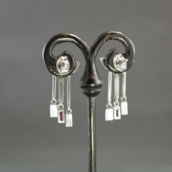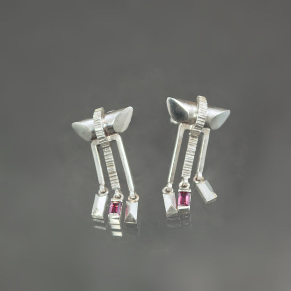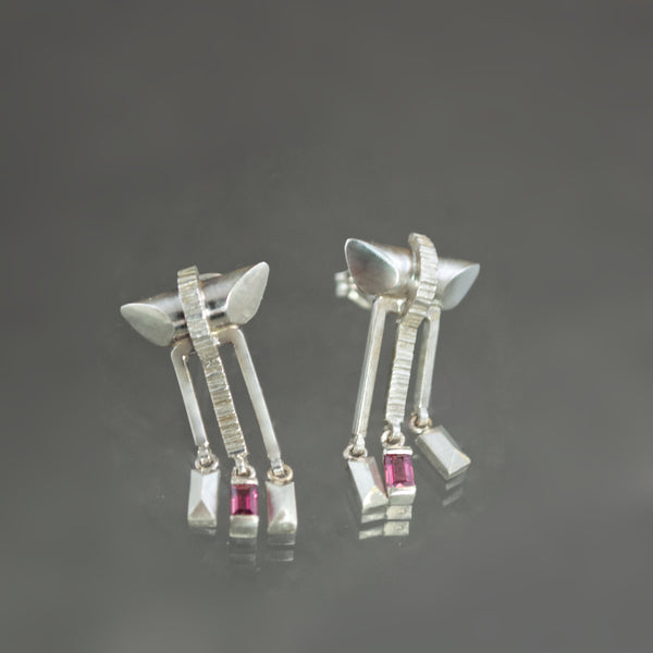 Hand built beginning with sterling silver wire, these delightful earrings add twinkle and delicacy to architectural angle. A rounded silver bar gives the impression of a pagoda-style roof - shaped and rounded on the ends for dimension and paneled flash. Below it, a squared arch of polished silver is split by a ribbon of coined texture that runs down the center of the earring. It terminates in a deep pink sapphire that is bar set into a glistening dangle. Fashioned in stepped ascending lengths, each arm of the arch, on either side of the sapphire, suspends a rectangular silver morsel of faceted fringe. Visually impactful but physically light, the earrings affix via a post and pushback closure.
