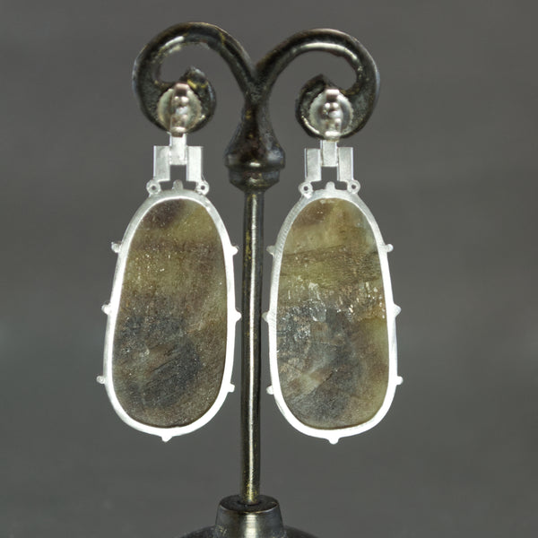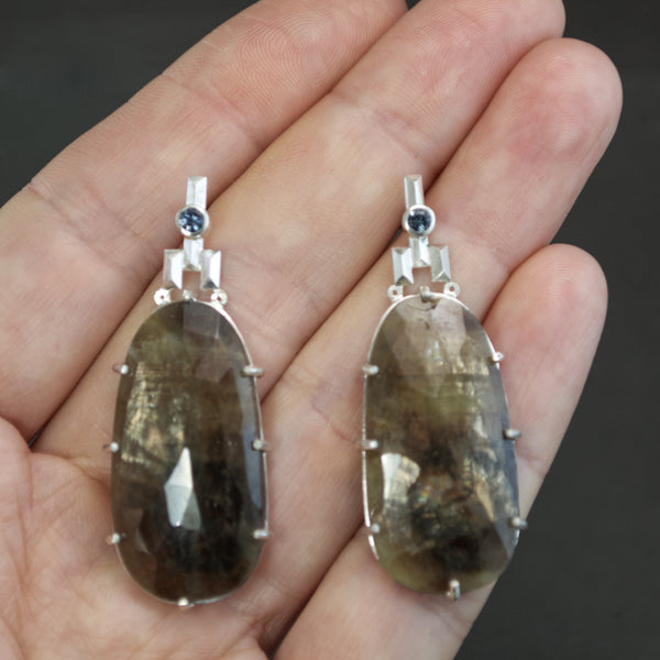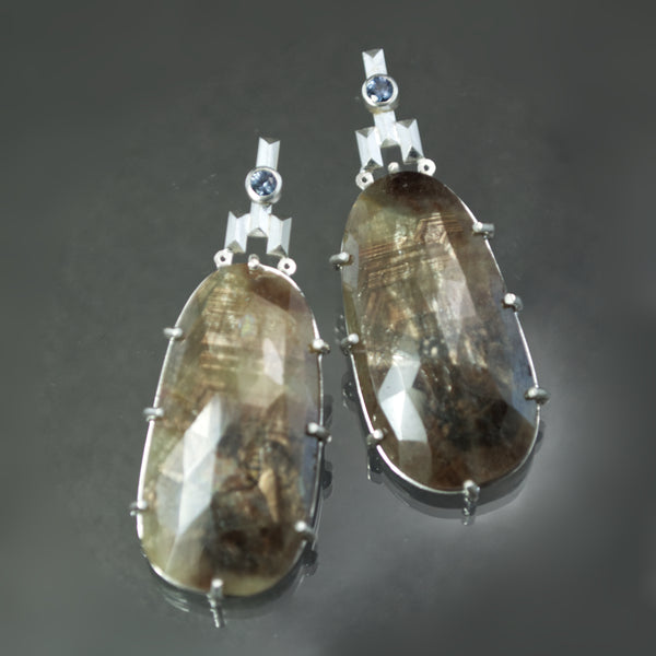 Mottled sapphires make an impact in these statement earrings. Clutched by 8 prongs, each natural sapphire exhibits an abstract palette of dusky tans to indigo with a delectable sheen that hints at the natural crystalline structure of each gem. A rosecut surfacing ensures a sparkle to the stones while an orderly faceted sterling silver topper reflects on nature's geometry in subtle Art Deco splendor. A bezel set natural blue sapphire twinkles from above each earring and conceals a post backing.