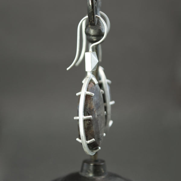 Art Deco geometry meets sapphire sheen in these sterling silver earrings. Each features an oval natural sapphire nugget, faceted for glimmer, and displaying a subtle crystalline sheen. In mottled shades of tan to indigo, each stone is clutched in a doubled sided prong setting with a matte finish halo of sterling surrounding. A faceted square culet ornament (Inspired by lapidary geometry and jazz age architectural motif) crowns each stone and affixes to a shepherd's hook.