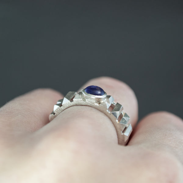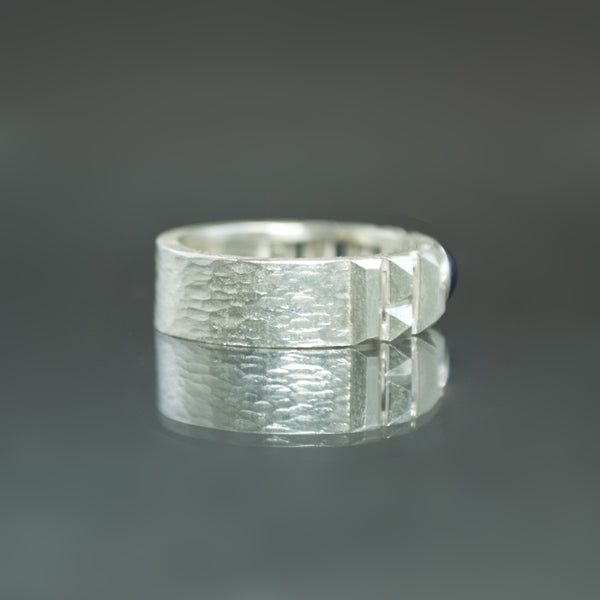 Combining a delicate look with architectural flair, this sterling silver and sapphire band makes a slim splash on the finger. The bezel-set natural star sapphire cabochon boasts a rich inky indigo hue and glossy polish. Geometrically faceted parallel bars of silver that roll down the ring's shoulders add brightness and velvet sheen, while a water textured panel wraps the back of the ring. The ornamentation of the ring sits atop a pair of rails, which allows an airy and comfortable fit. Its wearability and flat profile makes it easy to style solo or in a stack.