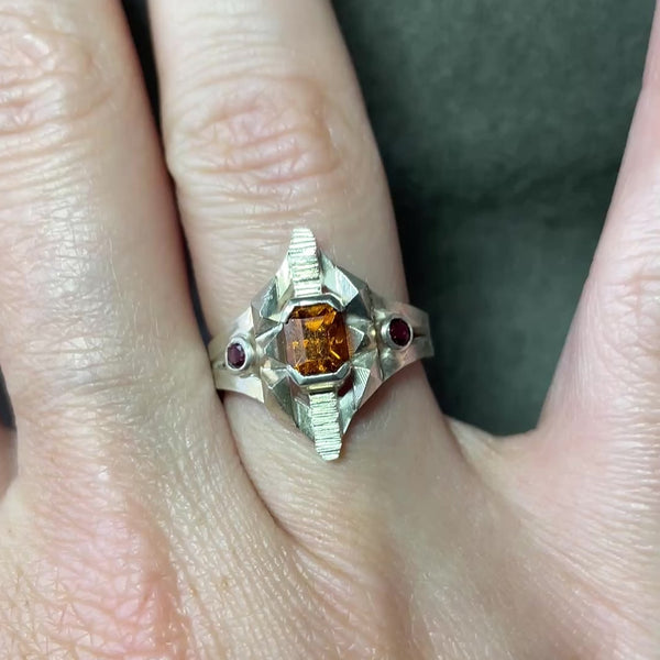 Warm hues and honed edges make an impact in this sterling silver ring. Entirely hand-fabricated beginning with wire and sheet stock, a split-shank band comes to a point at top and bottom to create a canvas for texture and stone. Spanning that frame is a trio of textured silver - a middle coined bar flanked on either side by a frusta-carved column. At the center of the tableau, an emerald-shaped spessartine garnet in vivacious tangerine tantalizes from a bracketed bezel setting. The entire design is bookended by a pair of bezel-set round red sapphires.